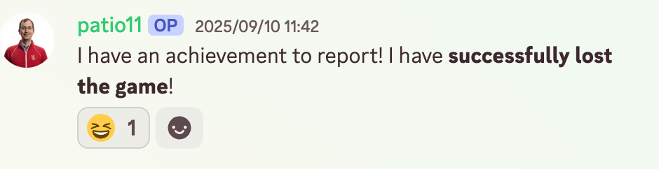 Ricki: Yep. I remember a few days before—Patrick had been keeping the team up to date on his progress as he worked through this, debugged, made iterations—I think four days before the conference itself, we saw a message from Patrick that said, "Update! Great news! I have successfully lost the game."