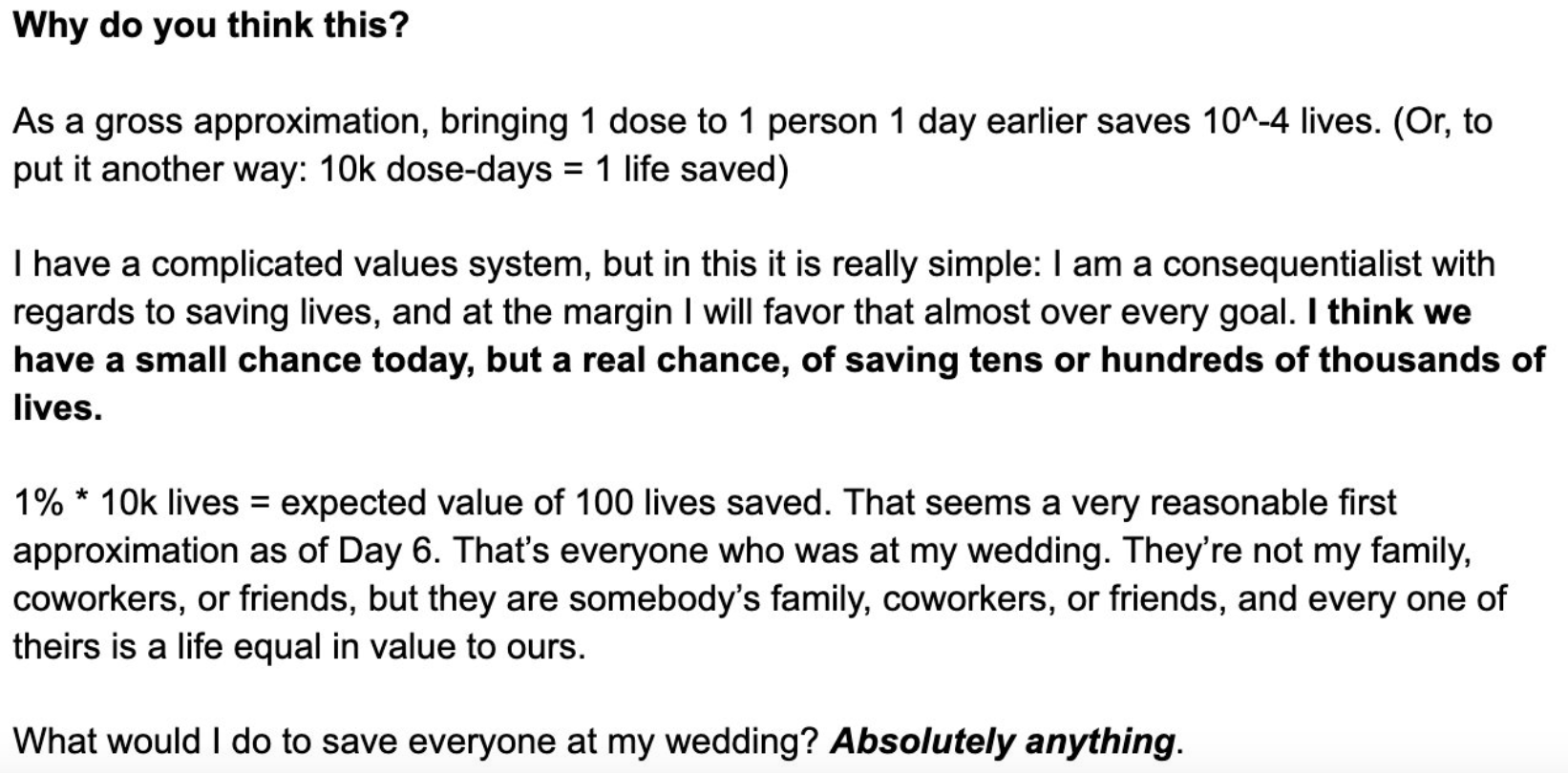 One of the lines in that was an expected value calculation: I said – I was quoting from memory from 2021 – but I said, “on the basis of the evidence in front of us right now, we think you need 10,000 dose-days of acceleration of the vaccine to save one life in expectation. The plausible path of execution for this buys a sufficient number of dose days such that this project saves 10,000 lives.
