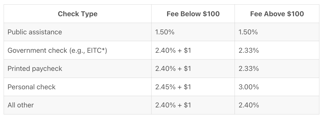 There exist two sources of credit risk in cashing a check, as we covered earlier. The pricing grid directly prices credit risk for the payer of the check, via bucketing them. It is not the most discerning risk analysis ever conducted in the financial industry, because you need to be able to explain it to extremely unsophisticated customers and only barely more sophisticated staff.